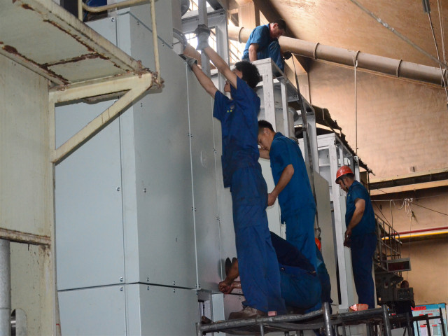 圖為施工人員對設(shè)備進行安裝工作。