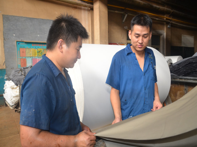 面三車間生產(chǎn)的功能性整理品種較多,使打底機染色面臨不小的難度。胡國濤通過對設(shè)備進行仔細觀察研究,跟維修師傅反復(fù)討論,在軋車前安裝固定導布軸,解決了軋車前起折子問題。再有,在紅外線烘室內(nèi)加入彎輥并調(diào)節(jié)張力,使產(chǎn)品通過打底機時不再“卡脖子”;以產(chǎn)品“棉錦c21*n100d+40d”為例,其一等品率由改進前的91%提升到改進后的96.5%,而這只是他眾多改進成果中的一項。