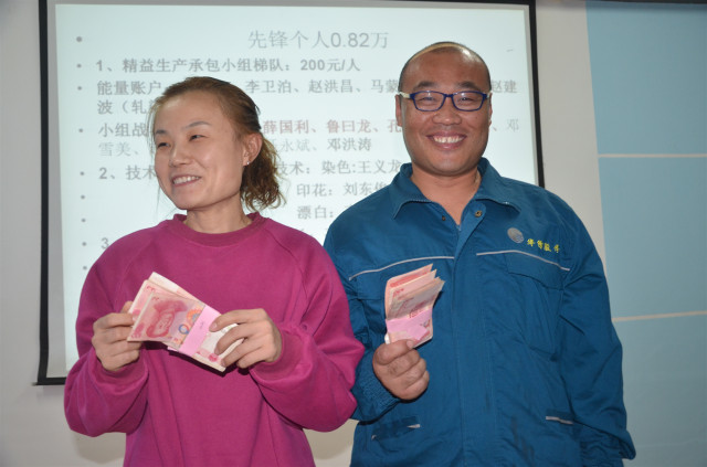 今年6月-10月,家紡車間精益生產(chǎn)小組成員標(biāo)準(zhǔn)操作能量值匯總排名前10位的員工是:340絲光精益生產(chǎn)小組朱兵兵以1585分排名首位,以下依次為:特整精益生產(chǎn)小組楊猛、定型整理精益生產(chǎn)小組趙洪昌、冷染精益生產(chǎn)小組陳長興、340絲光精益生產(chǎn)小組孔慶凡、冷染精益生產(chǎn)小組王士波、320拉幅精益生產(chǎn)小組劉曉斐、320拉幅精益生產(chǎn)小組馬蒙蒙、360定型拉幅機(jī)李奎、340絲光精益生產(chǎn)小組李海通。10月份精益生產(chǎn)小組(戰(zhàn)隊)前三甲為:360拉幅精益生產(chǎn)小組、320拉幅精益生產(chǎn)小組、印花精益生產(chǎn)小組。質(zhì)量完成好生產(chǎn)小組是:卷烘精益生產(chǎn)承包小組、印制精益生產(chǎn)承包小組、軋染精益生產(chǎn)承包小組和翻縫精益生產(chǎn)承包小組。340絲光機(jī)傘柄箱改造、燒毛機(jī)濾芯防護(hù)、軋光機(jī)尼龍輥處加照明、執(zhí)行管理標(biāo)準(zhǔn)化看板創(chuàng)新等四項提案,為10月份優(yōu)秀提案;“烽火狼戰(zhàn)隊”340絲光精益生產(chǎn)承包小組榮膺紅色千里馬錦旗,同時獲得每人2000元、小組總計10000元的獎金,另有四個小組分別獲得8000元、6000元、4000元、3000元不等的獎金;“質(zhì)量先鋒”卜程程、藺春嶺各獲2000元獎金。
