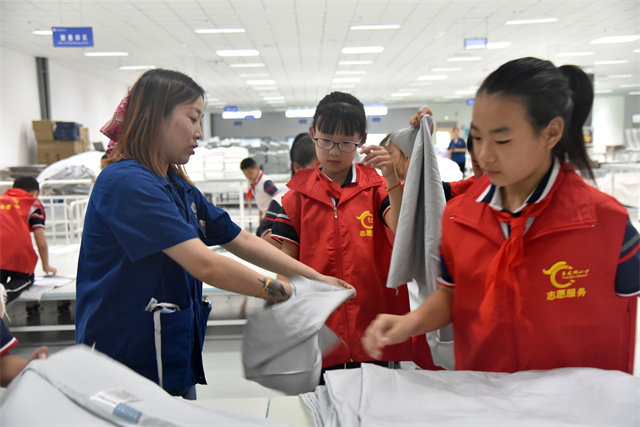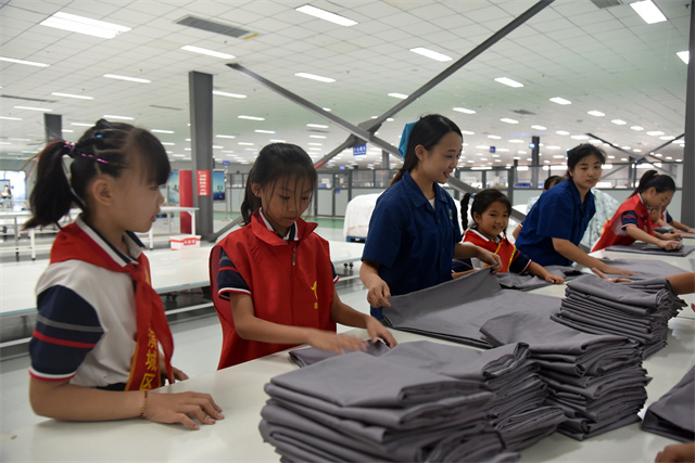 導(dǎo)讀:9月23日,濱城區(qū)玉龍湖小學四年級學生在老師帶領(lǐng)下走進公司,實地參觀了公司的生產(chǎn)車間以及部分展廳,現(xiàn)場體驗了家紡產(chǎn)品驗整及包裝等生產(chǎn)環(huán)節(jié),感受勞動的艱辛與快樂。