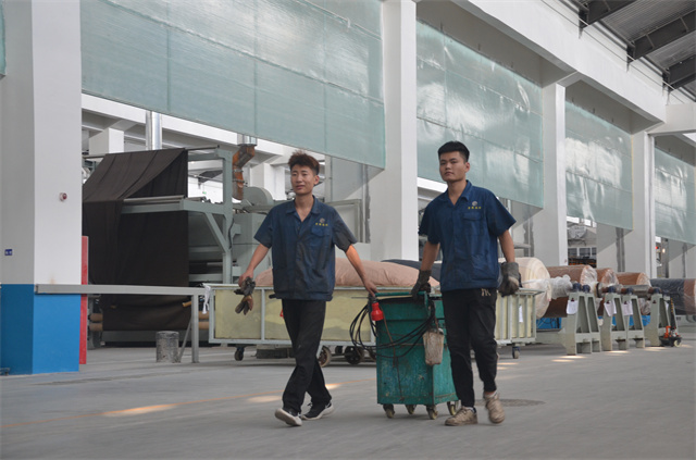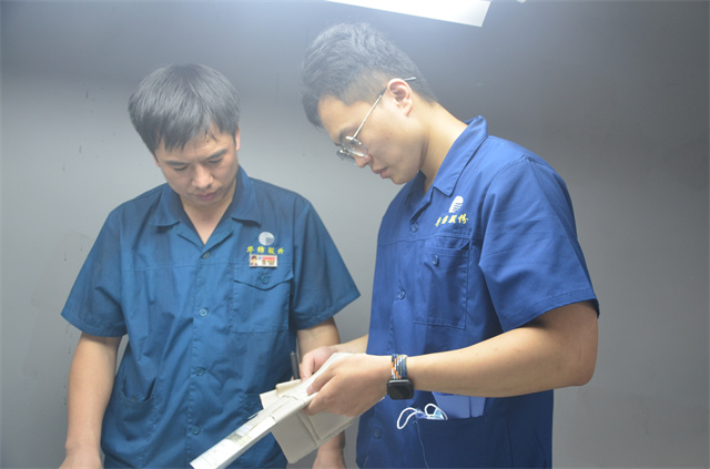 家紡車間丙班水洗機(jī)新員工劉叢叢(左),正在接受師傅的現(xiàn)場培訓(xùn)與指導(dǎo)。