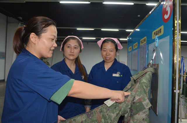 服裝車間員工現(xiàn)場(chǎng)討論推進(jìn)開源節(jié)流和質(zhì)量提升工作