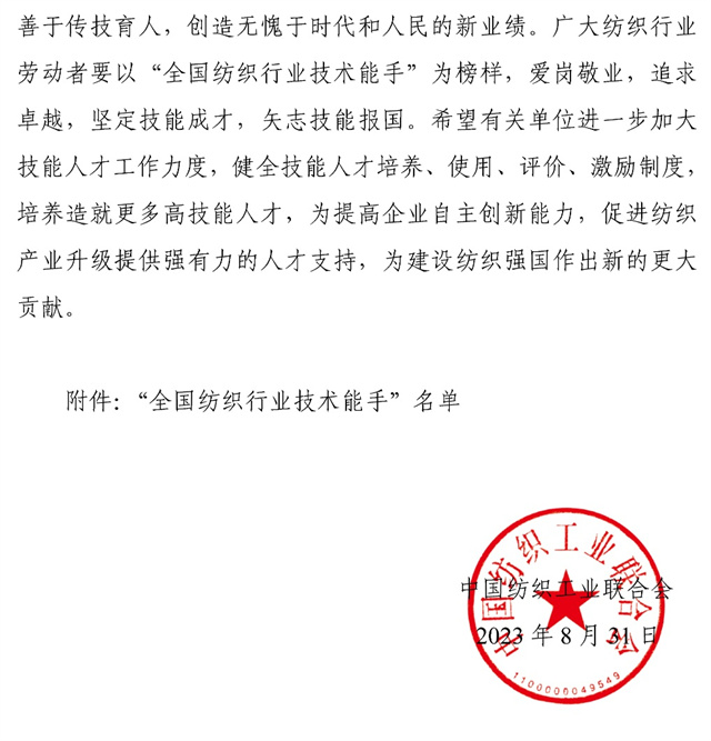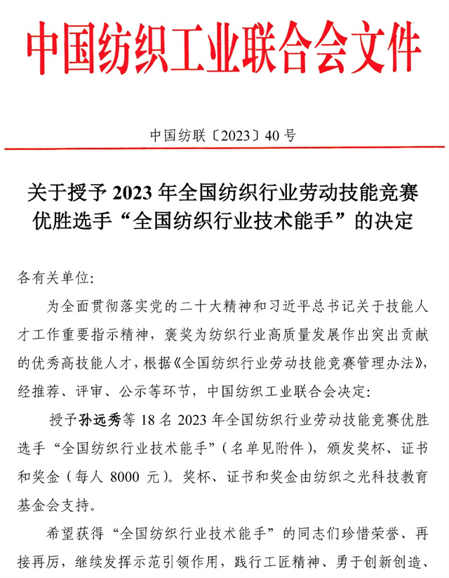 導(dǎo)讀:近日,中國紡織工業(yè)聯(lián)合會(huì)發(fā)布了授予在2023年全國紡織行業(yè)勞動(dòng)技能競賽中取得前18名的紡織企業(yè)員工為“全國紡織行業(yè)技術(shù)能手”榮譽(yù)稱號的決定,
