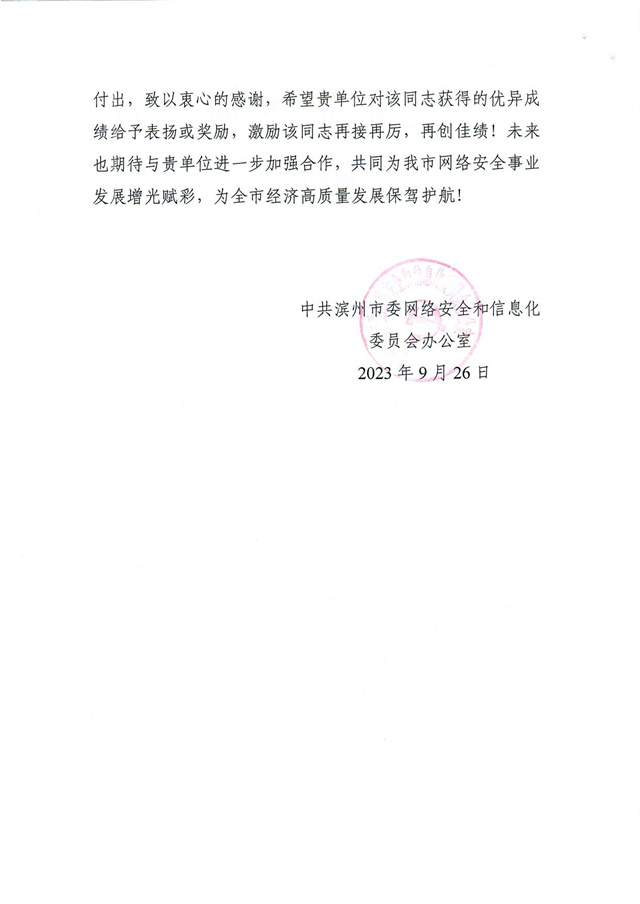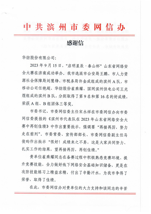 近日,公司收到一封來自濱州市委網(wǎng)信辦的感謝信,信中高度肯定了公司互聯(lián)信息部信息中心信息安全管理員崔乘耀在2023年9月15日“啟明星辰·泰山杯”山東省網(wǎng)絡(luò)安全大賽中所做出的突出貢獻,信中指出:“貴單位崔乘耀同志在備賽過程中積極熟悉競賽環(huán)境、提升競賽技能,全力做好線下網(wǎng)絡(luò)安全基礎(chǔ)知識儲備,更是在攻防技能練習上精益求精,付出了辛勤汗水,為我市爭得了榮譽,取得了佳績。”