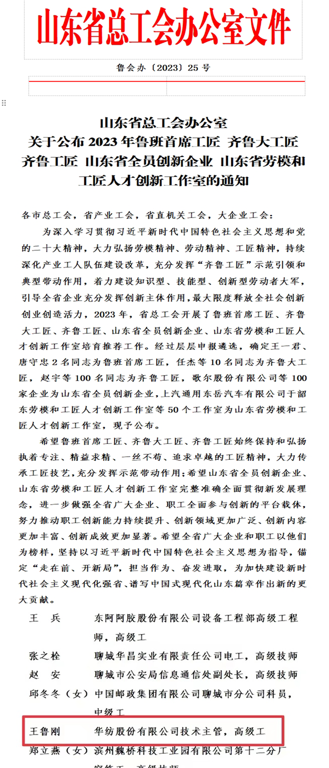 導(dǎo)讀:近日,省總工會(huì)下發(fā)通知,公布了多項(xiàng)獲獎(jiǎng)名單,其中,公司面料車間技術(shù)主管、高級工王魯剛榮獲第六屆“齊魯工匠”稱號(hào)。