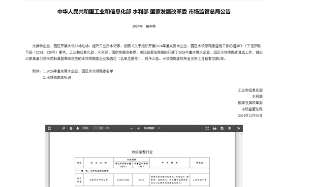 導(dǎo)讀:日前,國家工信部、水利部、發(fā)展改革委、市場(chǎng)監(jiān)管總局等四部門聯(lián)合公示了“2024年重點(diǎn)用水企業(yè)、園區(qū)水效領(lǐng)跑者名單”,公司成功入選國家級(jí)重點(diǎn)企業(yè)水效領(lǐng)跑者