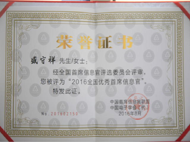 日前,中國首席信息官聯(lián)盟、中國電子學(xué)會對“2016年度全國優(yōu)秀首席信息官”評審結(jié)果進行了表彰,公司副總經(jīng)理盛守祥以在推進“數(shù)字華紡”“智慧華紡”建設(shè)方面的卓異業(yè)績,獲得這一殊榮。