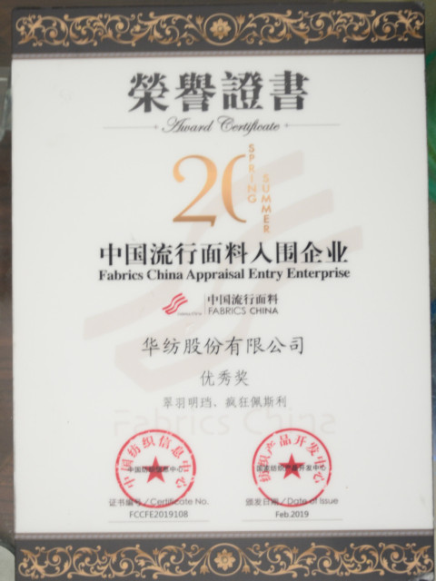 導(dǎo)讀:在剛剛結(jié)束的2019中國國際面料設(shè)計(jì)大賽、第41屆(2020春夏)中國流行面料入圍評審活動中,公司榮獲“2020春夏中國流行面料入圍企業(yè)”稱號。